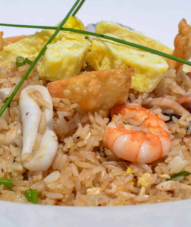Fuente de arroz chaufa con mariscos