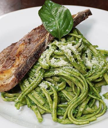 Tallarin al pesto con chuleta o bistec